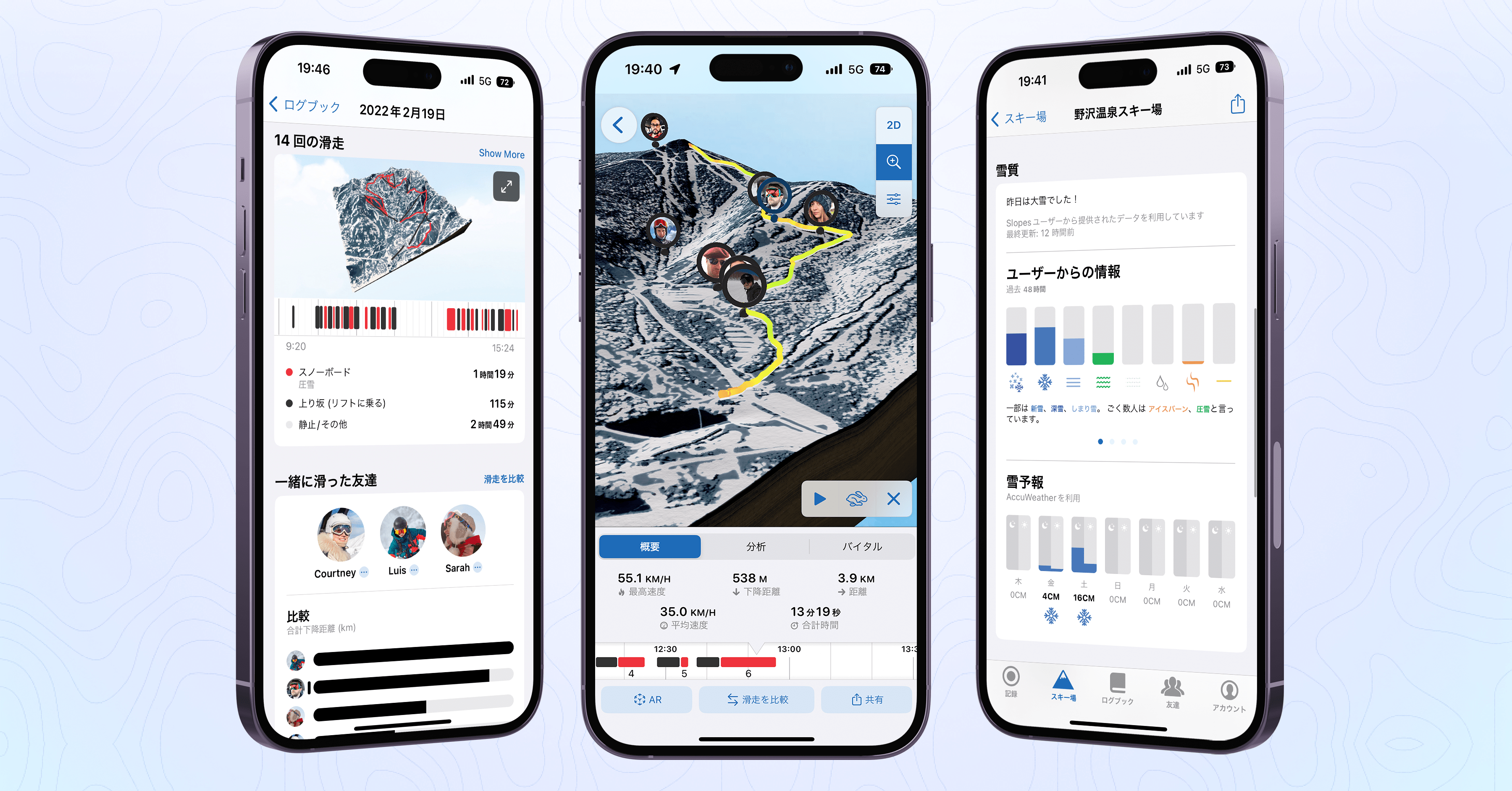 Slopesは日本のスキー場(約400箇所)を含む世界3500以上のスキー場に対応しており、ダウンロード数200万を超える世界で最も使用されているウィンタースポーツのトラッキングアプリです。