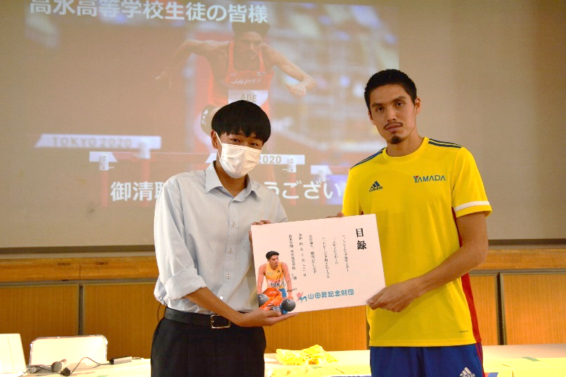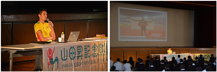 講演会では、自身の高校から大学時代の活躍、その後の低迷期、そしてオリンピック出場までの経験を通じた喜びや挫折、スランプからの抜け出し方の他、夢・目標を叶える為の信念などを語りました。