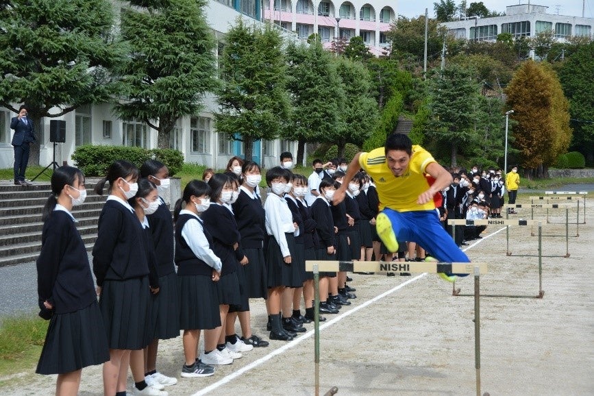 ヤマダホールディングス陸上競技部T&Fに所属していた400mハードルの東京五輪 元日本代表である安部孝駿氏(2022年9月引退)による実技パフォーマンスを披露しました。間近で見る元オリンピック選手の動きに、生徒の皆さまからは大きな歓声があがりました。