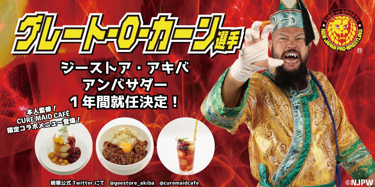 全国5カ所(秋葉原・大阪・名古屋・小倉・仙台)展開中のキャラクター・ライフスタイル・ストア「ジーストア」の運営などを手掛ける「タブリエ・マーケティング株式会社」は、「ジーストア・アキバ」アンバサダーに就任した新日本プロレス『グレート-O-カーン』選手考案の限定コラボメニューを発表。10月28日(金)より、「ジーストア・アキバ」内の<CURE MAID CAFÉ(キュアメイドカフェ)>にて提供する。