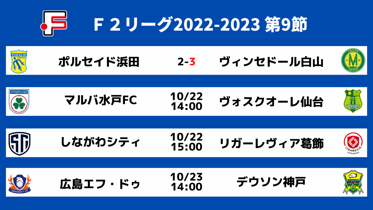 10月22日(土)、10月23日(日)に開催するFリーグ2022-2023 ディビジョン2 第9節の3試合を以下の通り、ELEVENにてライブ配信いたします!全試合を無料でご視聴いただけますので、ELEVENのアプリをダウンロードいただき、ぜひご視聴ください!