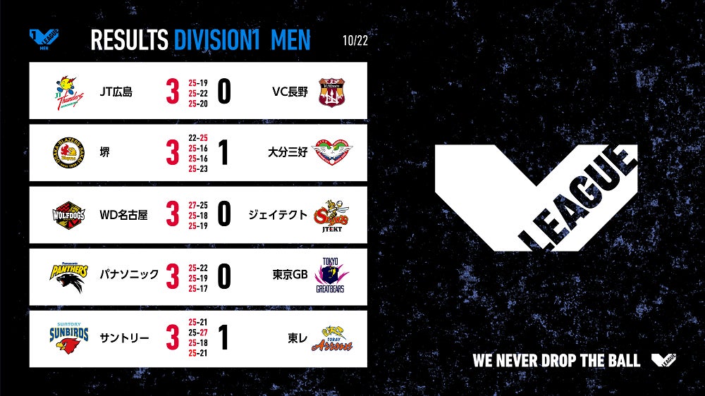 バレーボール国内最高峰リーグV.LEAGUE【10月22日の試合結果】