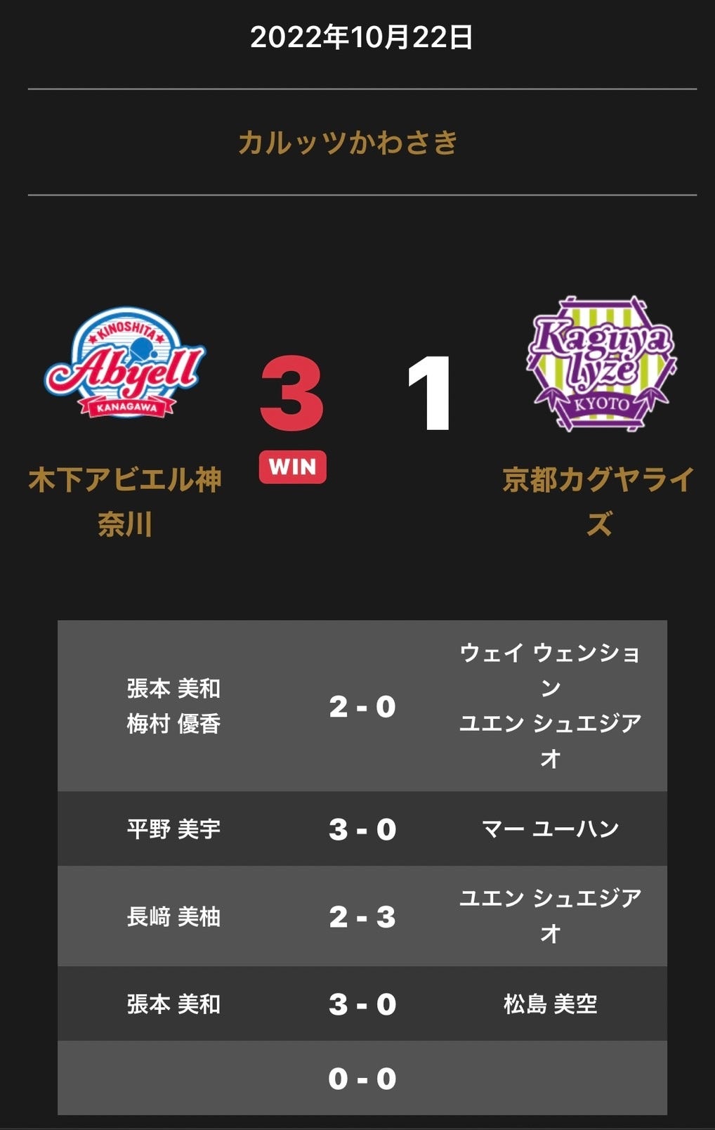 木下アビエル神奈川と京都カグヤライズの試合は3-1で木下アビエル神奈川が勝利しました。
