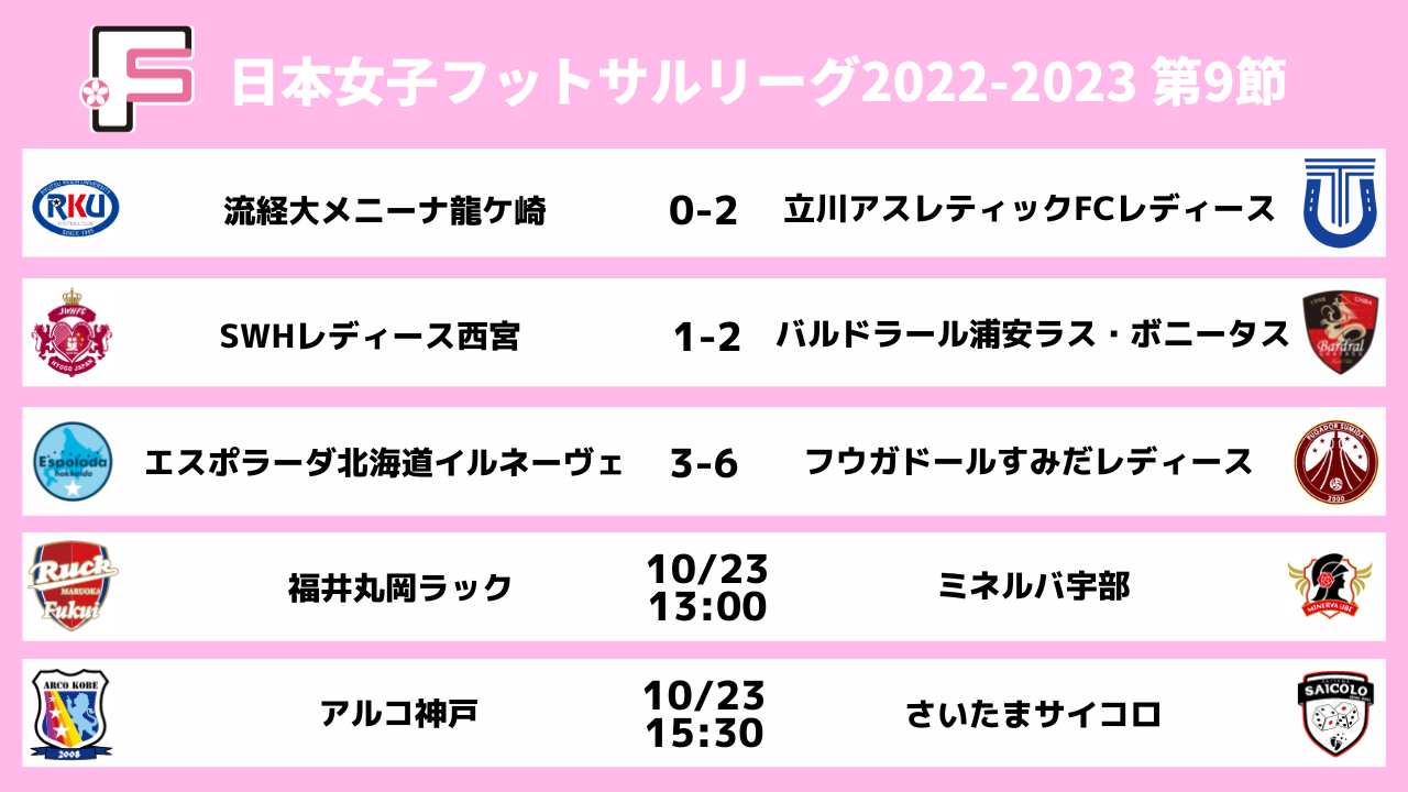 10月23日(日)、福井県営体育館にて日本女子フットサルリーグ2022-2023 第9節(代替)の2試合を開催します。今節もSPOTV NOW(登録・視聴無料)にて全試合をライブ配信いたしますので、ぜひご視聴ください!