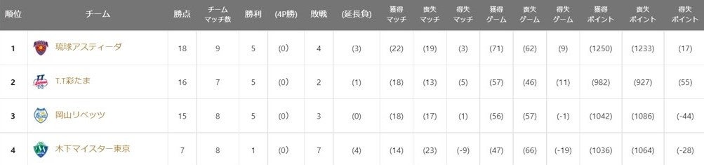22日(土)琉球との2度のファイナルゲームにもつれる熱戦をいずれも制したT.T彩たまは、翌日、岡山にも勝って4連勝とし2位に浮上。曽根 翔が2勝0敗とし、エースの活躍がチームを支える。敗れた琉球は、KM東京とのビクトリーマッチを勝ち切り首位をキープ。第5ゲームまでもつれた第4マッチ、ビクトリーマッチといずれも勝利した吉村 真晴の勝負強さが光る。イ サンスが加入した岡山は、そのイ サンスの活躍もあり1勝1敗。3位と順位は落としたものの、シングル勝利数1位のハオ シュアイは2勝0敗と好調をキープしており、消化試合数の差もある中では、3チームが三つ巴の首位争い繰り広げている。ホーム開催にて連敗となったKM東京だが、23日のようなビクトリーマッチ負けが4試合と紙一重の戦いが続いている。