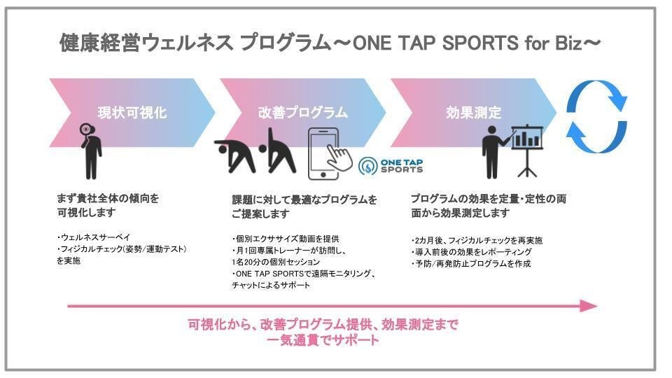 ウェルネスサーベイよりフィジカル不調者を抽出し、不調者それぞれに合ったエクササイズを提供します。また、ユーフォリアが開発したアプリ「ワンタップスポーツ」をワーカー向けにアレンジ。スポーツトレーナーが日々の体調や活動内容をモニタリングし、プログラムの継続をサポートします。オンラインだけでなく、現地に赴き直接個別に指導も行うハイブリッドなプログラムが特徴です。