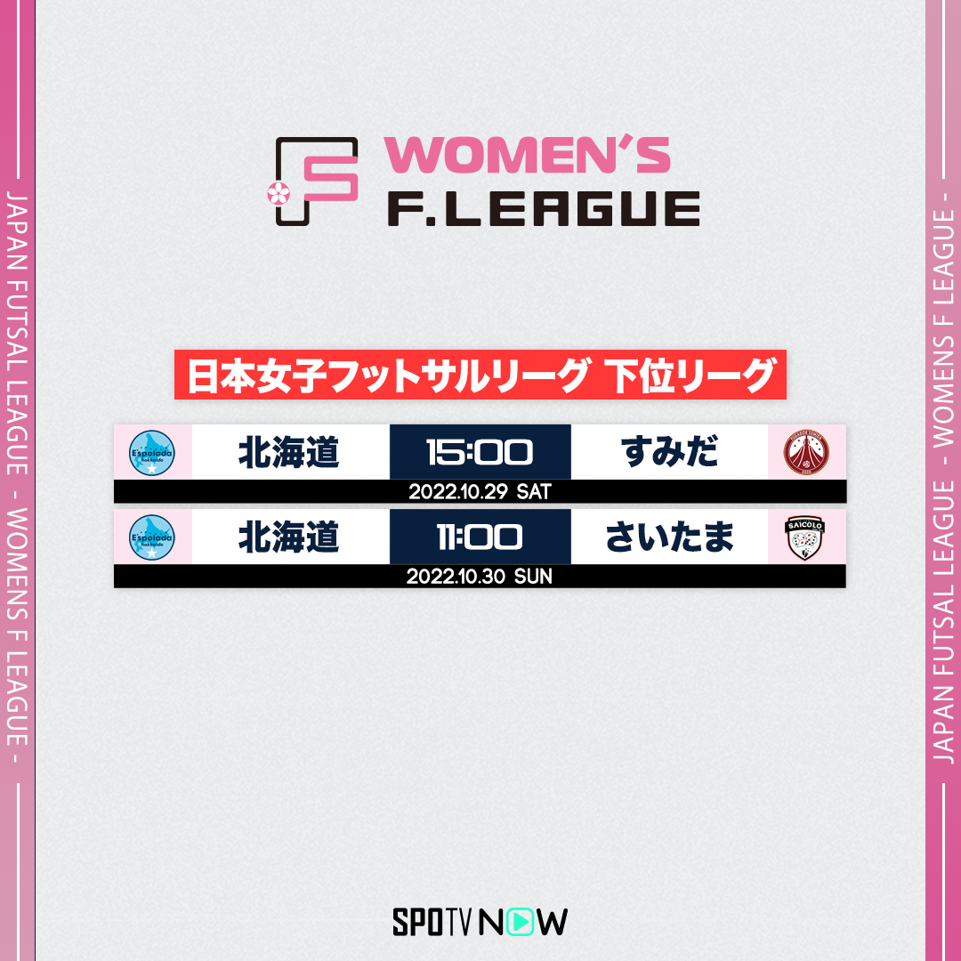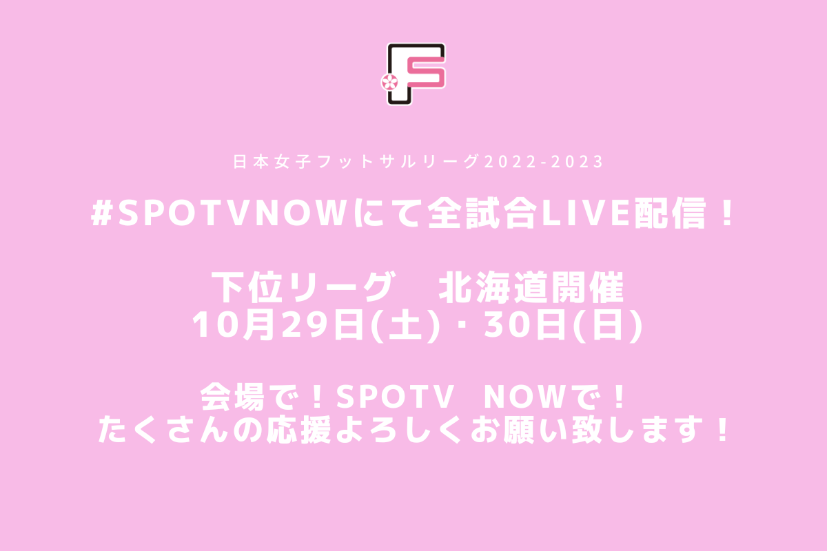 10月29日(日)・30日(日)に、函館アリーナにて日本女子フットサルリーグ2022-2023 下位リーグの2試合を開催します。今シーズンもSPOTV NOW(登録・視聴無料)にて全試合をライブ配信いたしますので、ぜひご視聴ください!