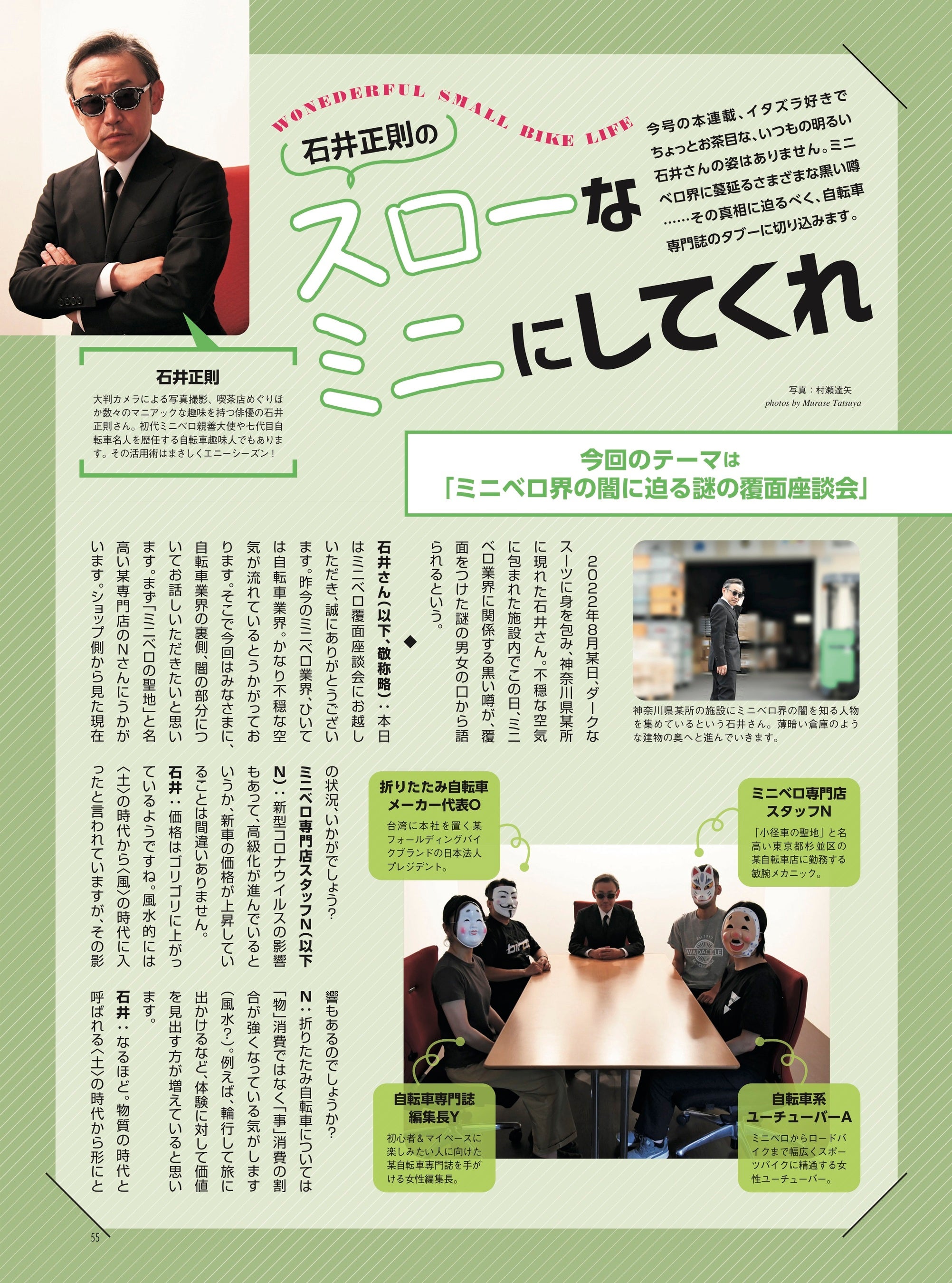 俳優石井正則さんの超ゆるーい連載。今回のテーマは「ミニベロ界の闇に迫る謎の覆面座談会」。ミニベロ業界だけでなく自転車業界全体にも関わる「闇」……自転車専門誌のタブーに石井さんが切り込む!?