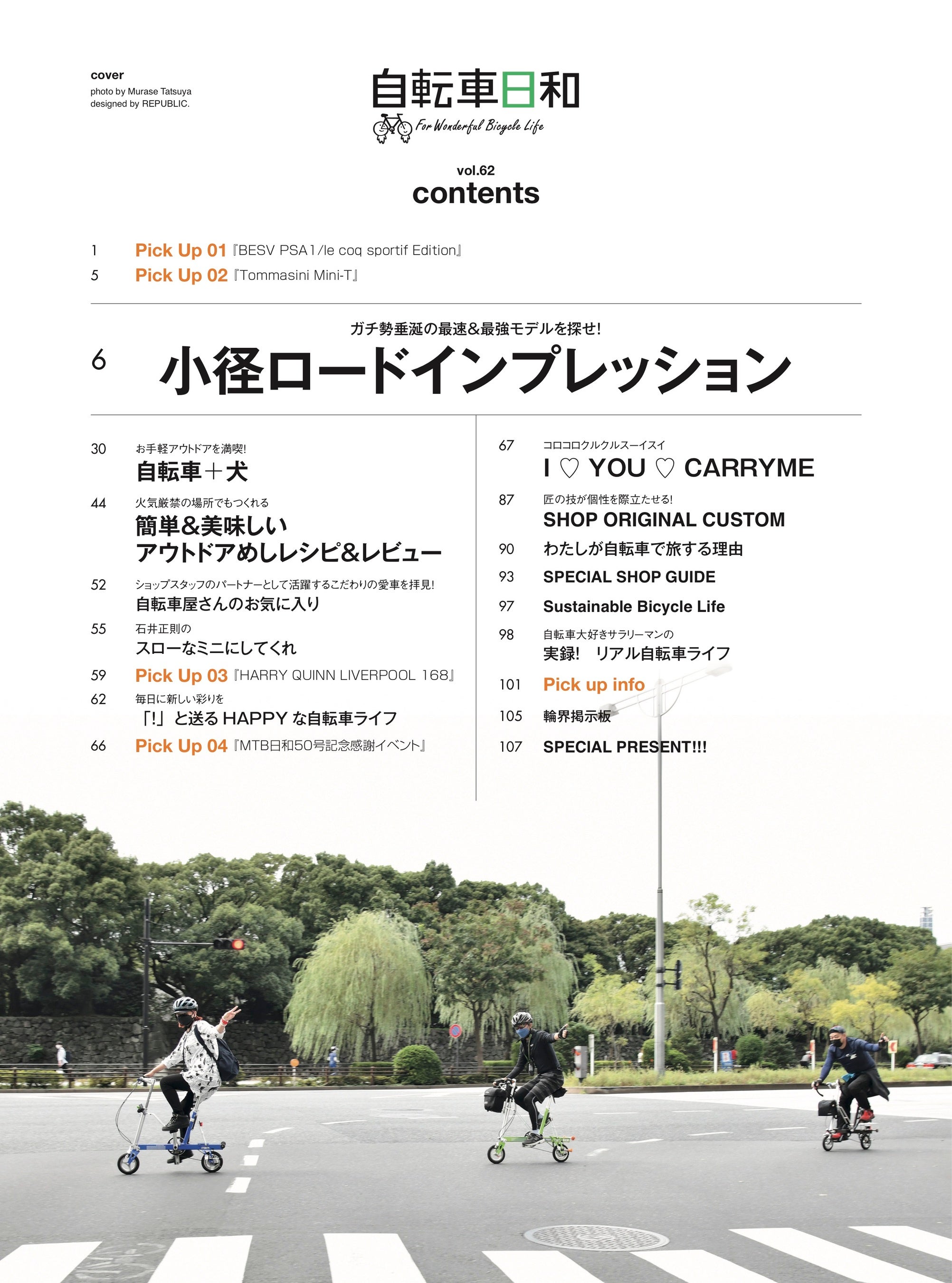 辰巳出版(本社:東京都文京区、代表取締役社長:廣瀬和二)が発行する自転車ライフスタイル誌『自転車日和』の最新号が10月31日(月)に発売されます。特集では、小さな車輪にドロップハンドルを装備した「小径ロード」をピックアップ。ロードバイクに匹敵する!? その走りについて検証します。また、「自転車+犬」企画では、愛犬と一緒に出かけたくなるさまざまなサイクリングスタイルやエピソードを紹介。愛犬に限らず、ペットとのサイクリングに役立つ癒し効果抜群の内容です。