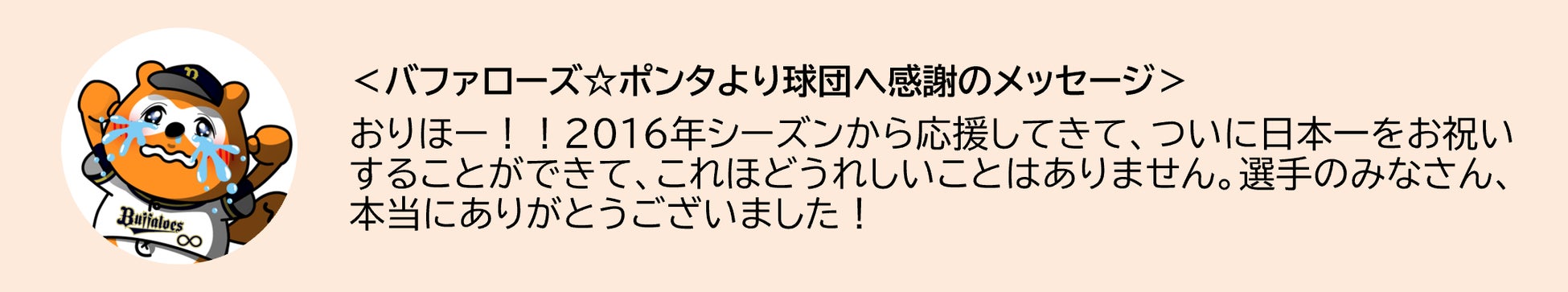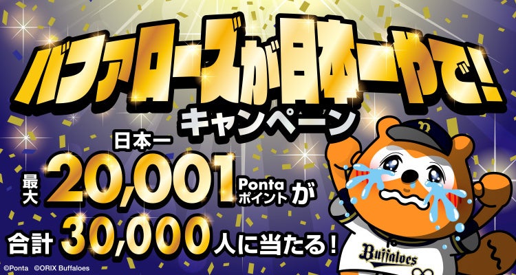 共通ポイントサービス「Ponta(ポンタ)」を運営する株式会社ロイヤリティ マーケティング(本社:東京都渋谷区、代表取締役社長:長谷川 剛、以下「LM」)は、2016年シーズンからオリックス・バファローズのスポンサーをしており、2022年シーズンはユニフォームパンツスポンサーとして応援企画を展開しています。オリックス・バファローズが日本シリーズを制し、2022年シーズンの日本一となったことを記念して、2022年10月31日(月)~11月20日(日)、合計30,000名様にPontaポイントや選手のサイン入りバファローズ☆ポンタぬいぐるみなどが当たるキャンペーンを実施します。