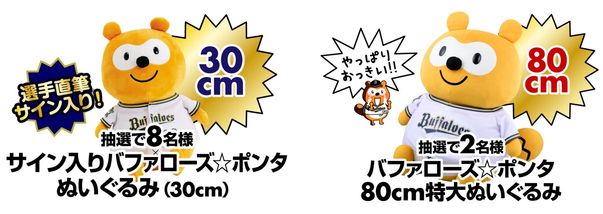 | ③ | エントリーのみ | 抽選で、8名様に選手の直筆サイン入り バファローズ☆ポンタぬいぐるみ(30cm)または抽選で、2名様にバファローズ☆ポンタ80cm特大ぬいぐるみ |