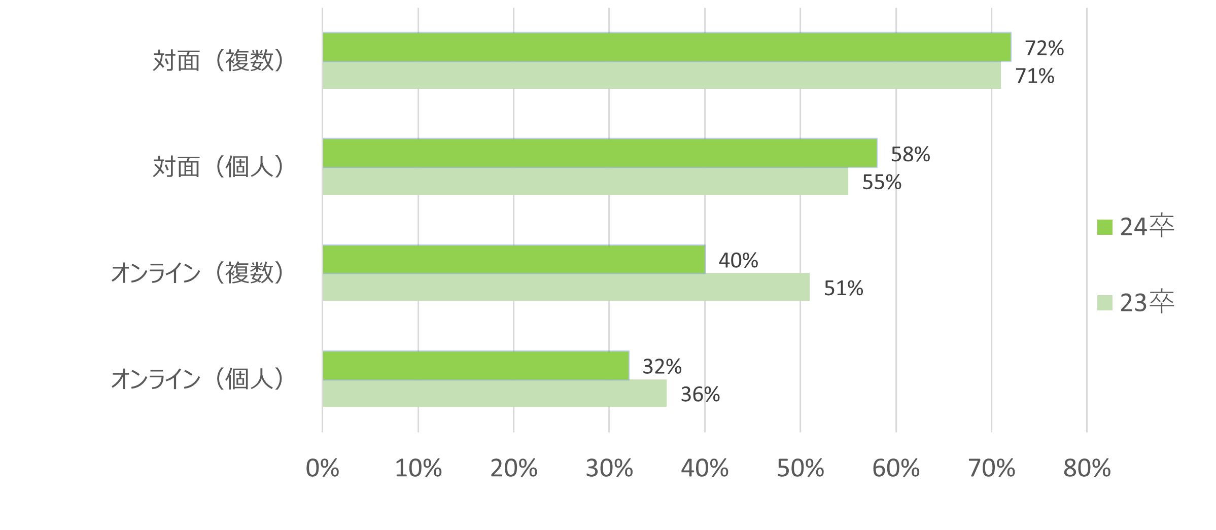 インターンシップの希望参加形態について最も多かったのは【対面(複数)】となった。23卒と比較すると、オンラインより対面を希望する割合が増加している。学生からは、個人だと緊張する、複数のほうが参加ハードルが低い、という声があがっている。