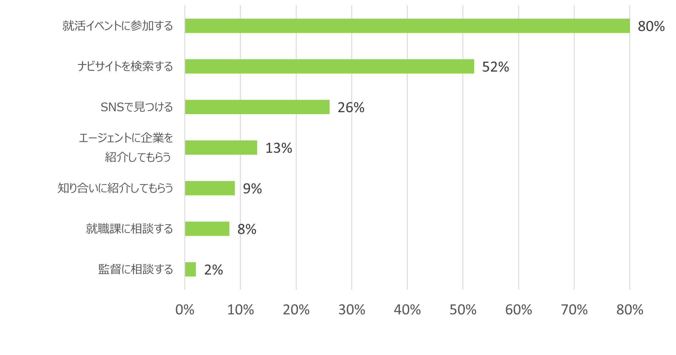 【就活イベントに参加する】という回答が最も多く80%、次いで【ナビサイトを検索する】が52%だった。