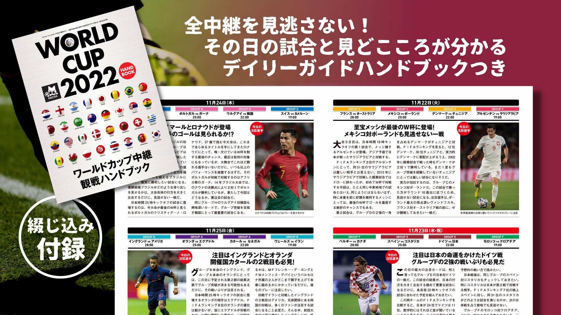 さらに、「ABEMA」の試合中継番組表と連動した綴じ込み付録「ワールドカップ中継観戦ハンドブック」もついています。本誌から取り外して持ち歩けるので、いつでも、どこでも、中継を見ながら楽しめます。その日の試合と見どころが分かる「デイリーガイド」をチェックして、観戦スケジュールを立てるのも楽しいですね。付録巻末には、各試合ごとの最終成績を書き込める「スコアシート」も収録しています。