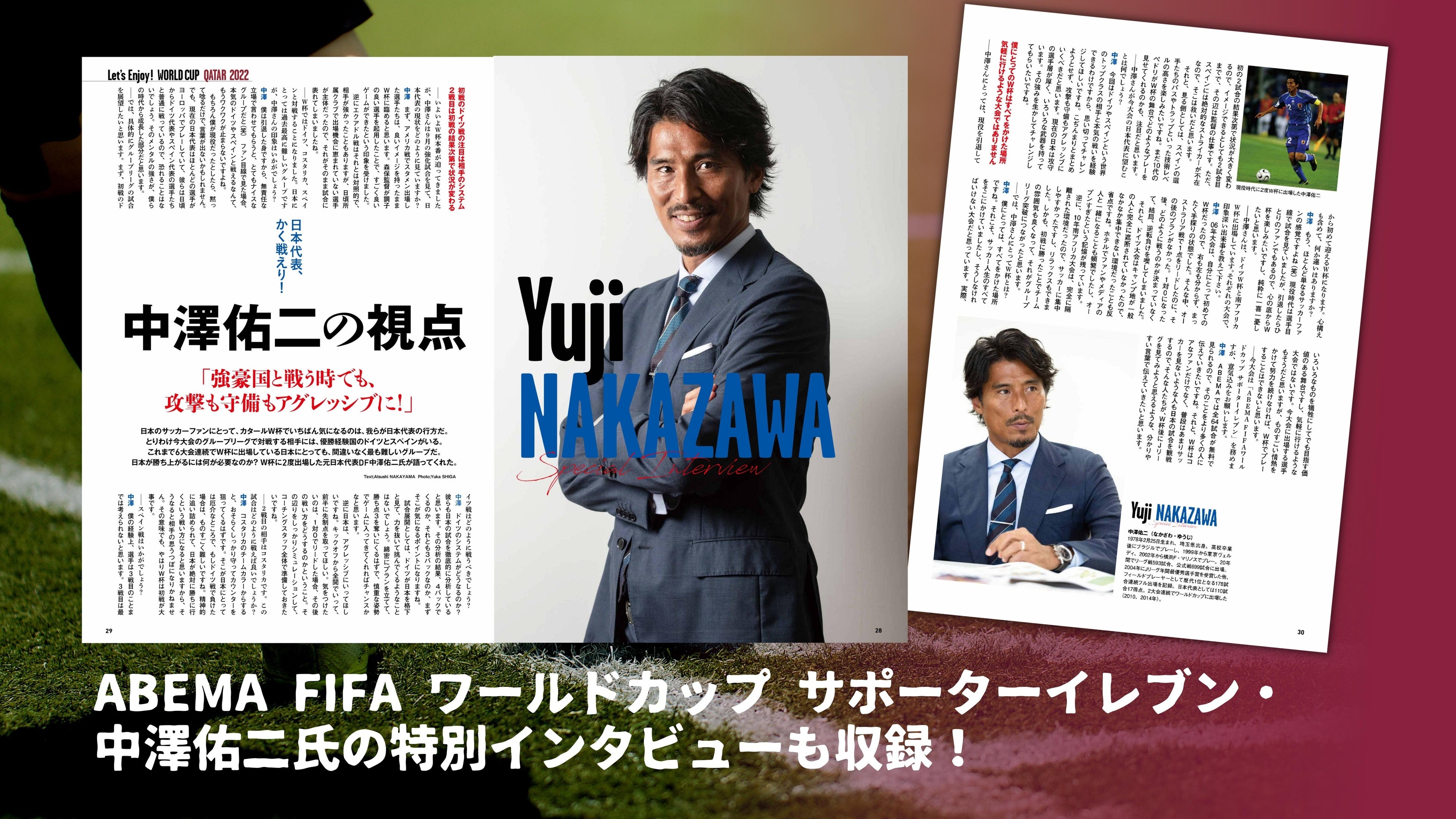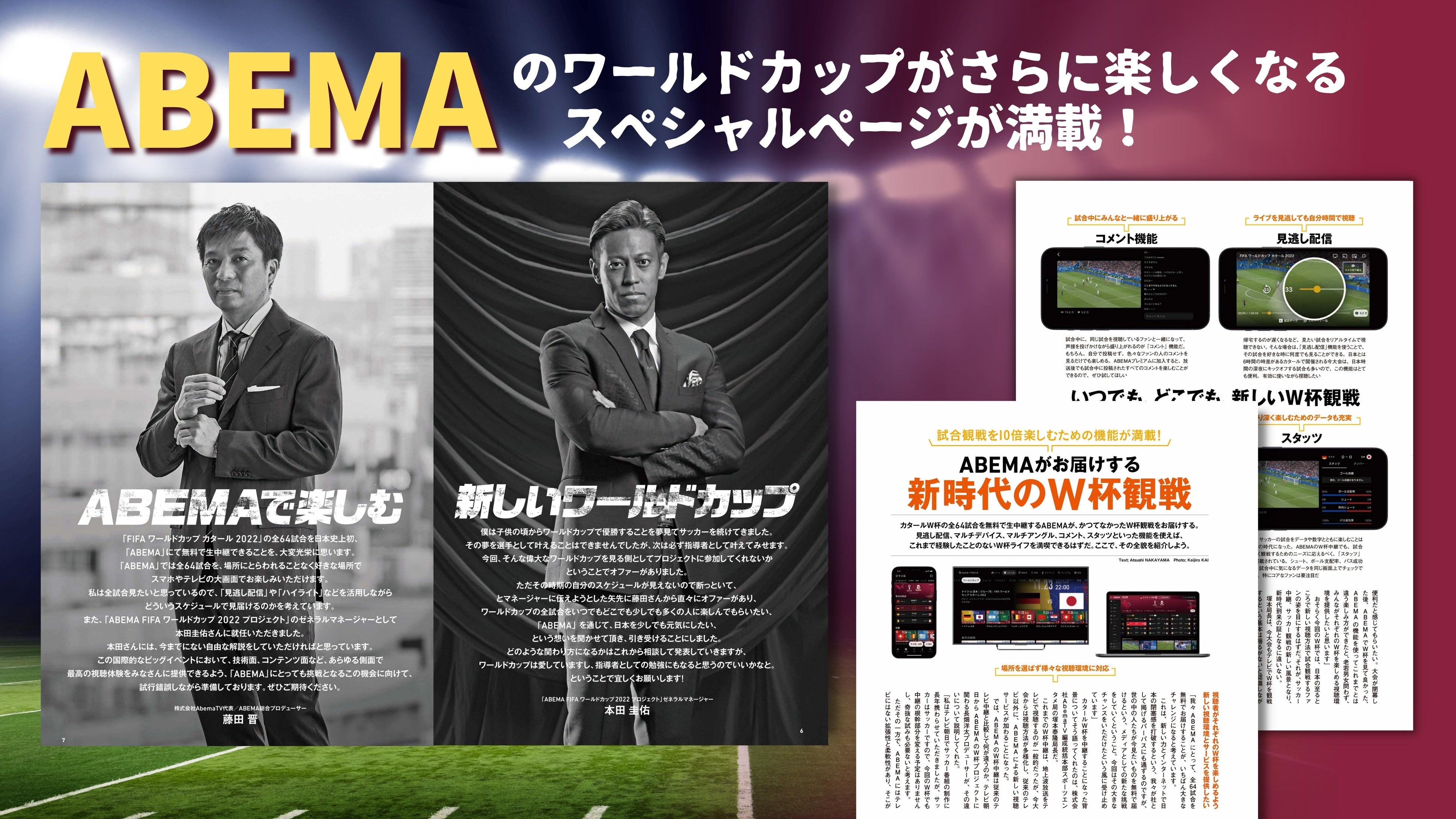 「ABEMA FIFA ワールドカップ 2022 プロジェクト」のGM(ゼネラルマネージャー) 本田圭佑氏と、株式会社AbemaTV代表/ABEMA総合プロデューサー 藤田晋氏からのスペシャルコメントを筆頭に、「ABEMA FIFA ワールドカップ サポーターイレブン」に就任された中澤佑二氏の特別インタビューを掲載。「ABEMA」のW杯中継をあますことなく楽しむための「番組視聴ガイド」や、「中継スケジュール表」も完全収録しています。