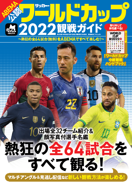 『サッカー・ワールドカップ2022観戦ガイド』は、11月20日より開幕するW杯の無料中継に加え、「ABEMA」が配信するW杯関連番組をもれなく楽しむための、「ABEMA」公認・W杯観戦ガイドブックです。