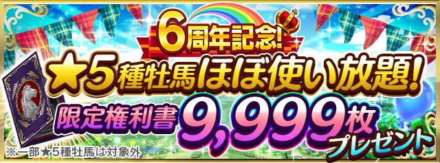 ■6周年記念 ★5種牡馬ほぼ使い放題!限定権利書9,999枚プレゼント