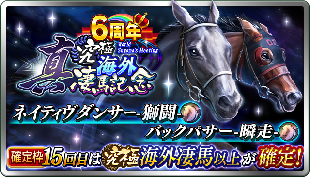 2022年11月1日(火)0:00から 2022年11月6(日)23:59までの期間、速力・底力・短距離の3つの因子を持つ「ネイティヴダンサー-獅闘-」や速力・短距離の因子を持つ「バックパサー-瞬走-」が初登場する「真究極海外凄馬記念」が開催中です。