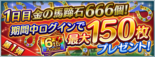 2022年11月1日(火)4:00から2022年12月12日(月)3:59まで期間内に、最大15日ダビマスにログインすると「金の馬蹄石×666個」と「6th Anniv.チケット」を最大150枚もらえるログインボーナスが開催中です。