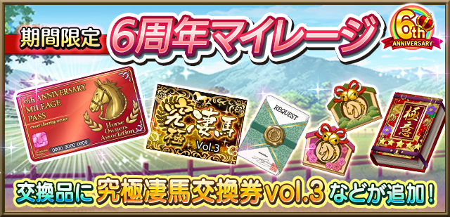 6周年マイレージを購入すると、ゲーム内の行動によってえられるptで「究極凄馬交換券 vol.3」、「予想依頼書【5年】」、「調教の書・極意【★5以上】」、「松葉色の大絵馬」、「梅紫色の大絵馬」といった様々なアイテムと交換できます。