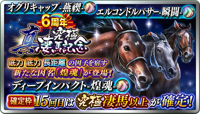 2022年11月1日(火)0:00から 2022年11月6(日)23:59までの期間、底力・底力・長距離の3つの因子を持つ「ディープインパクト-煌魂-」や速力・長距離・堅実の3つの因子を持つ「オグリキャップ-燕禊-」、短距離・底力の因子を持つ「エルコンドルパサー-瞬闘-」が初登場する「真究極凄馬記念」が開催中です。