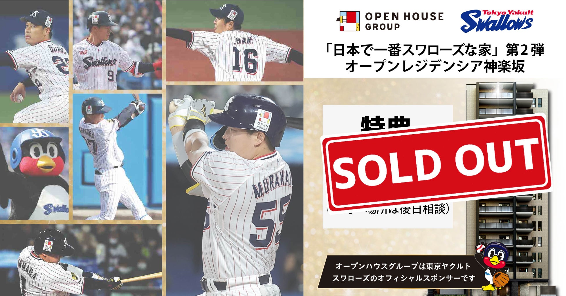 当社は10月18日にスワローズCS突破記念として、当社グループの新築マンション「オープンレジデンシア神楽坂ファースト」に「好きな選手1名と記念撮影」ができる特典がついたコラボ物件「日本で一番スワローズな家」企画を発表いたしました。