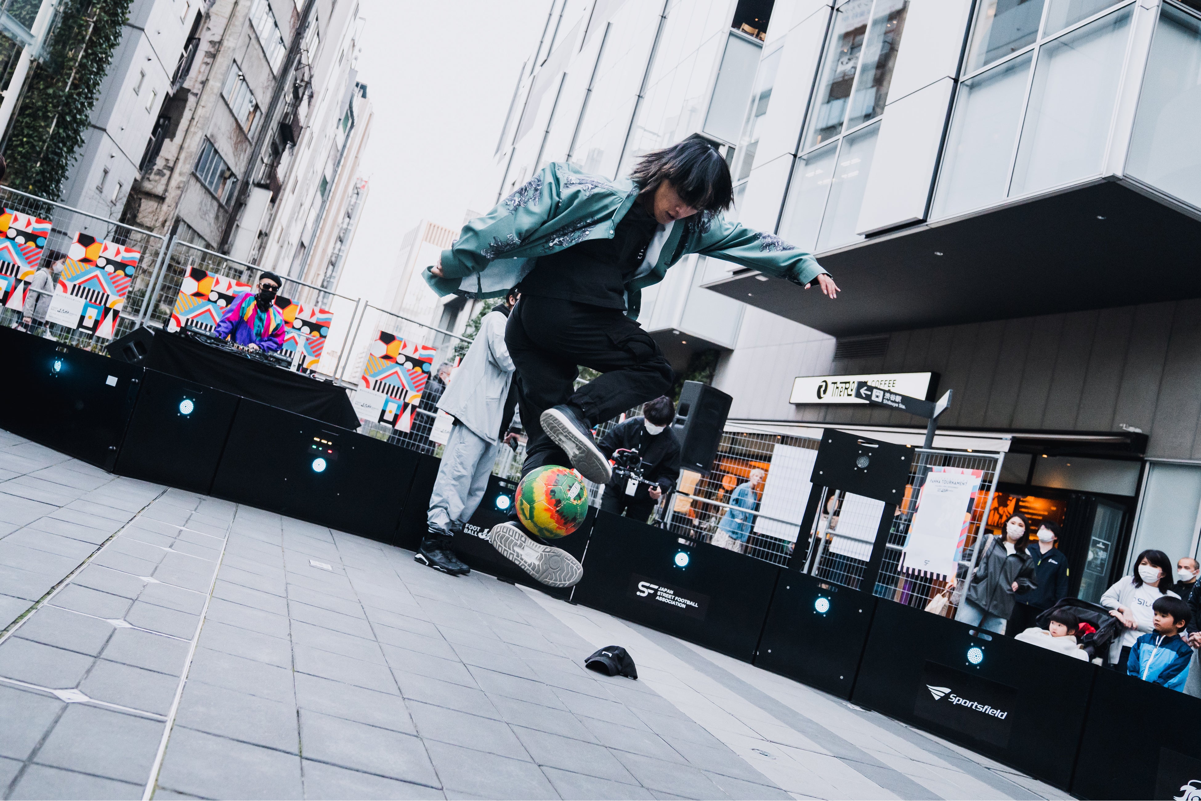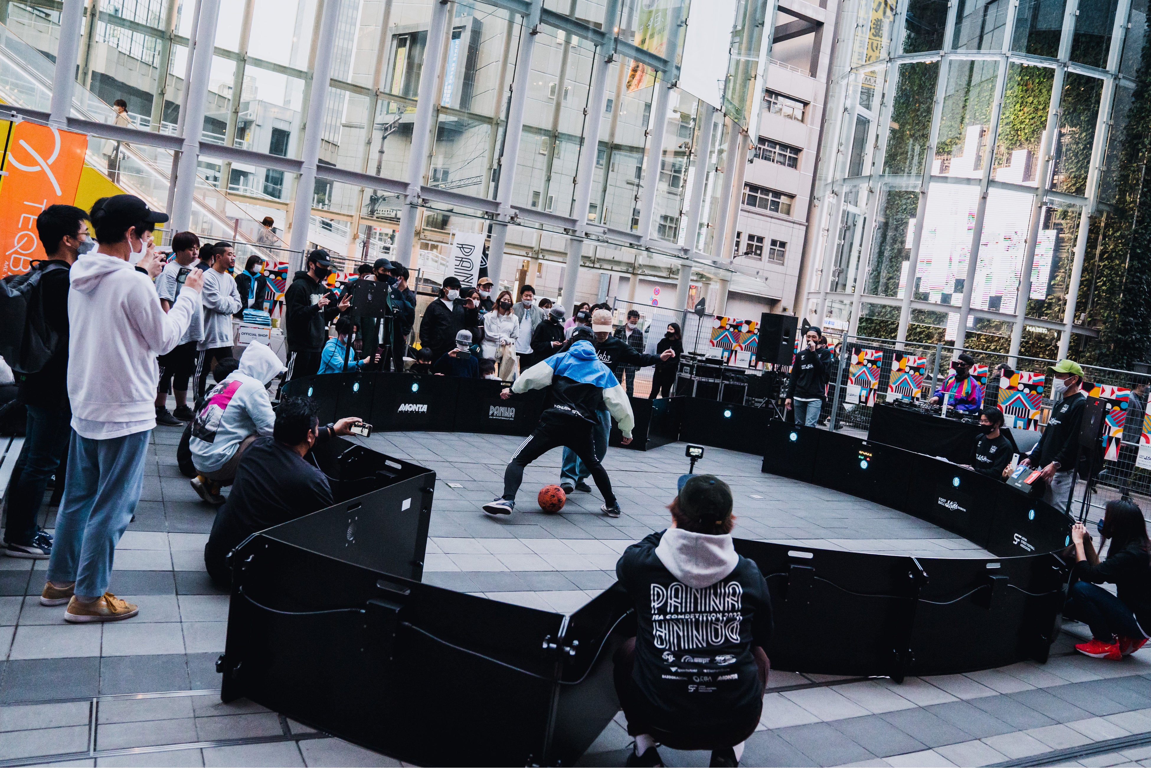 渋谷ストリーム前 稲荷橋広場では、サッカーコンテンツをぎゅっと詰め込み誰もが楽しめる空間になってるとともに、世界レベルのストリートサッカーとフリースタイルフットボールを見ることができる。