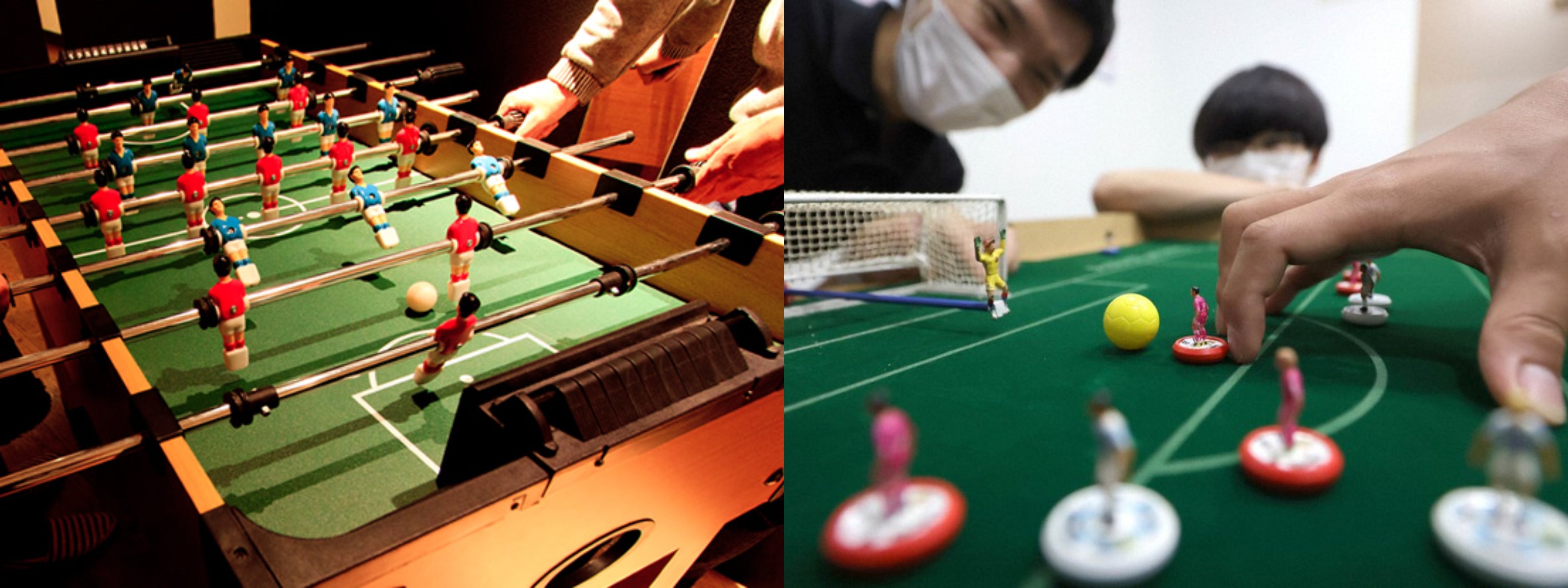テーブルサッカーは、人形を使ってボールをコントロールしシュートを決め得点を競うゲーム。