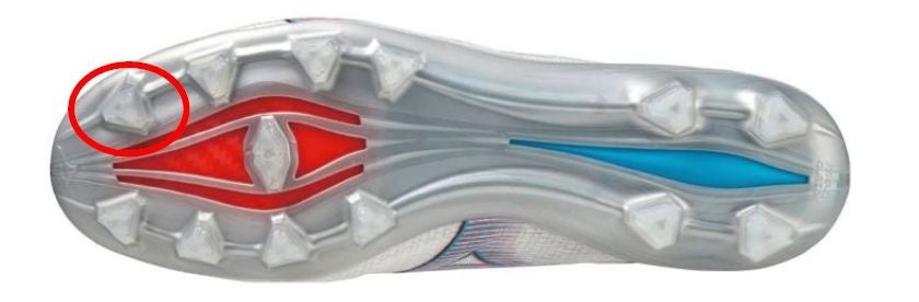アウトソール部は、基本的なスタッド配置はミズノサッカーシューズのフラッグシップモデル「MORELIA(モレリア)」シリーズを参考に設計しつつ、より縦へのスピード、クイックな動きにフォーカスした構造を実現するため、トライアングルスタッドを採用しています。 (写真赤丸部)
