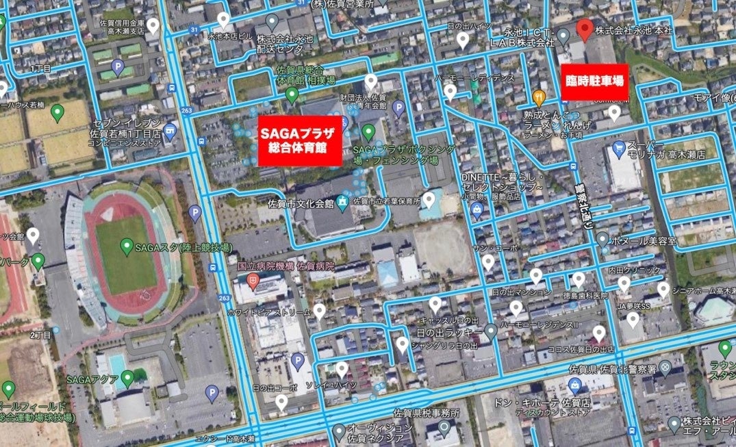 ※株式会社永池様の本社駐車場(佐賀県佐賀市高木瀬町東高木262番地1)を臨時駐車場としてご利用いただけますが、駐車できる台数に限りがございますので、なるべく乗り合わせの上、ご来場ください。