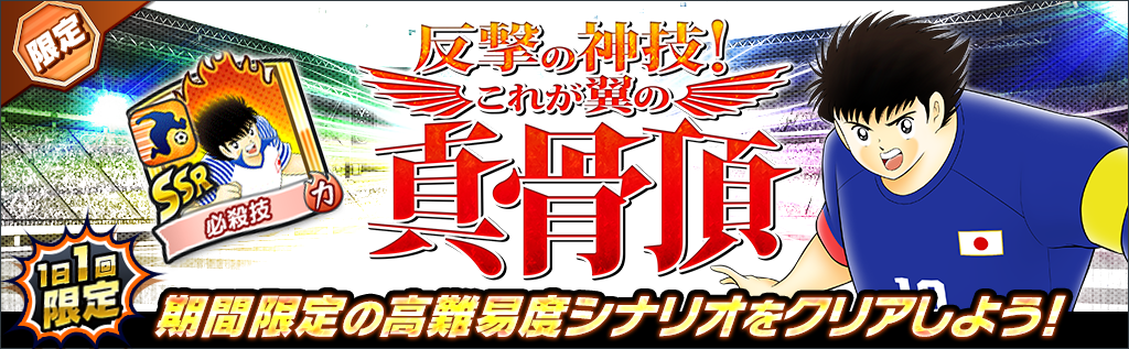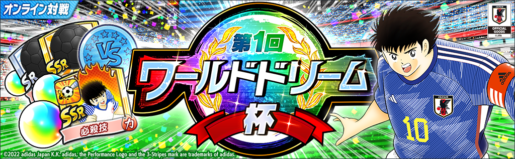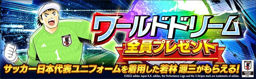 KLab株式会社(本社:東京都港区、代表取締役社長:森田英克、以下「KLab」)が提供するスマートフォン向け対戦型サッカーシミュレーションゲーム『キャプテン翼 ~たたかえドリームチーム~』では、11月4日(金)から12月2日(金)にかけて、サッカー日本代表公式ユニフォームを着用したSSR 若林 源三 などが登場する「ワールドドリームキャンペーン」を開催いたします。