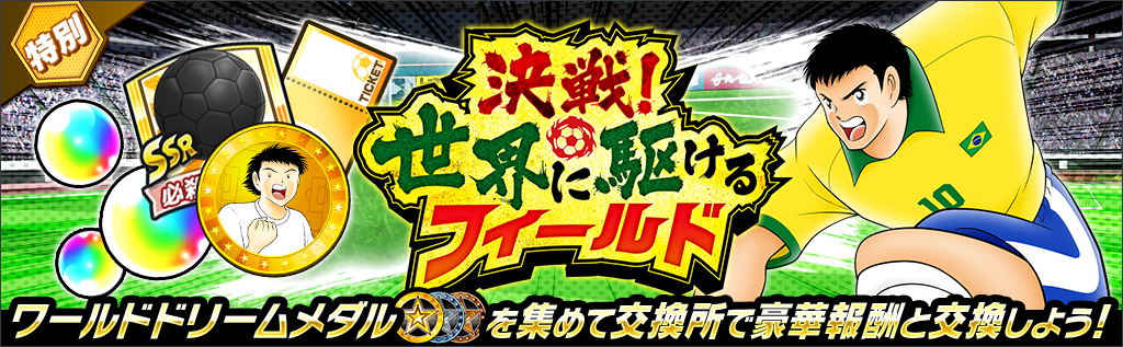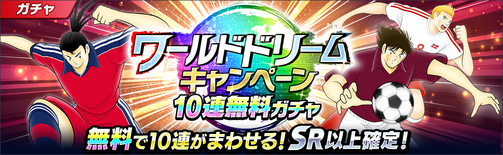 本日から「ワールドドリームキャンペーン 10連無料ガチャ」、「ワールドドリーム 全員プレゼント」、「たたかえ蒼き戦士たち サッカー日本代表ガチャ」など様々なイベントを実施していますので是非アプリよりご確認ください。