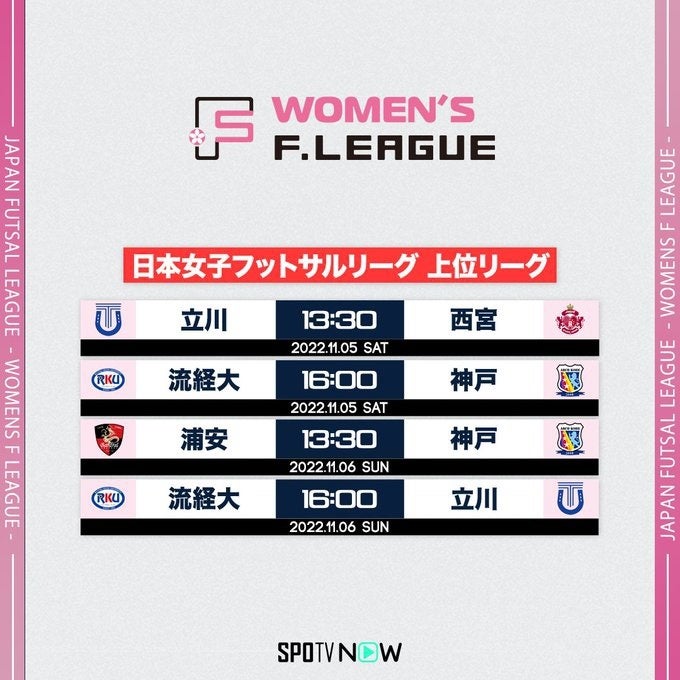 リーグ優勝を目指し熱戦を繰り広げる日本女子フットサルリーグ上位リーグを、会場で、SPOTVNOWのライブ配信で、お楽しみください!