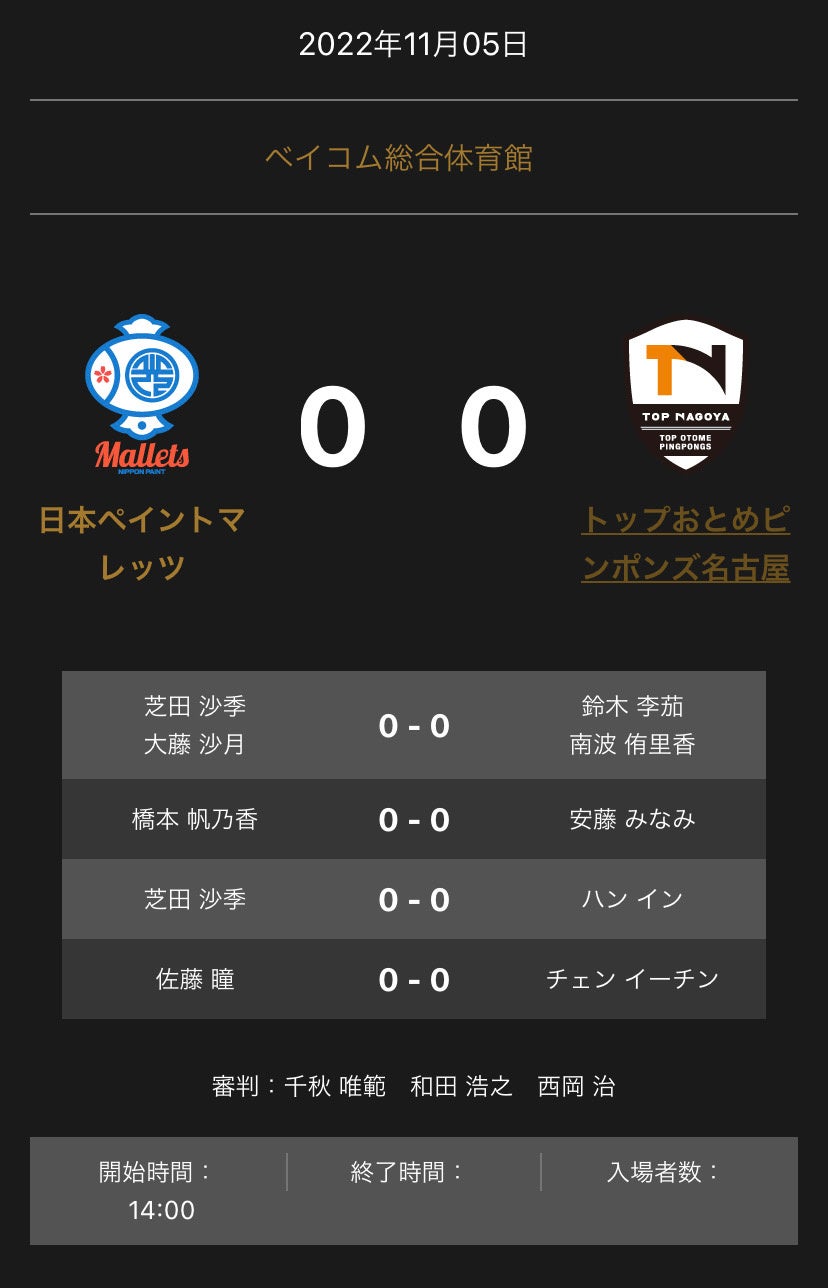 ノジマTリーグ 2022-2023シーズン 公式戦 11月05日開催 ベイコム総合体育館(兵庫県) 日本ペイントマレッツ vs トップおとめピンポンズ名古屋 対戦オーダーが発表されました。