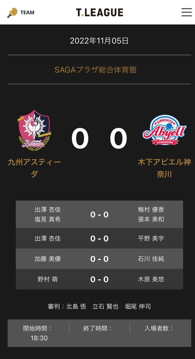 ホームプレスリリース 11月5日(土)18:30 試合開始 九州アスティーダ vs 木下アビエル神奈川 対戦オーダー発表 2022年11月05日 18時08分 公開|スポーツマニア編集部プレスリリース 一般社団法人Tリーグのプレスリリース 11月5日(土) 18:30 試合開始 試合会場 SAGAプラザ総合体育館 九州アスティーダ vs 木下アビエル神奈川 対戦オーダーが発表されました。