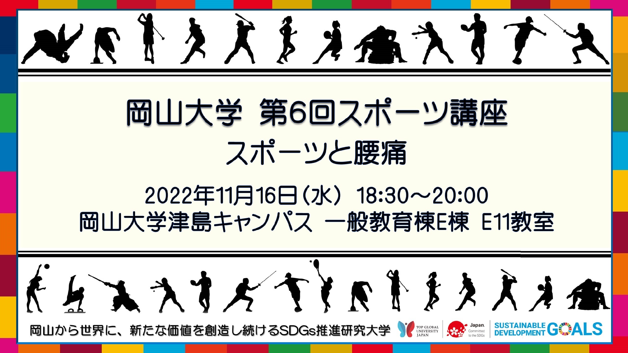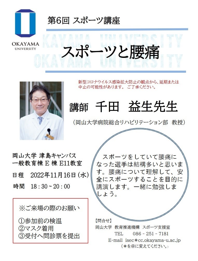 今回、第6回となるスポーツ講座「スポーツと腰痛」を2022年11月16日(水)に岡山大学津島キャンパス(岡山市北区)にて開催します。