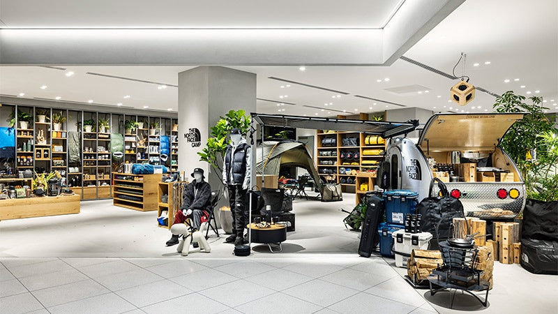 THE NORTH FACE初のキャンプ特化型となる新業態「THE NORTH FACE CAMP」では、はじめてのキャンプやファミリー層に向けた誠実かつ共感を持ったフレンドリーな接客と合わせて、“BASE CAMP” という THE NORTH FACE が長年向き合ってきた概念と体験を通して、人々の冒険を後押しする、新たなキャンプスタイルを提唱します。キャンプギアの取扱数はゴールドウインの中でも最大級の品揃えを誇り、キャンプに関する専門知識と接客スキルを併せ持つスタッフが「THE NORTH FACE」が提案する多彩なキャンプの魅力を発信します。