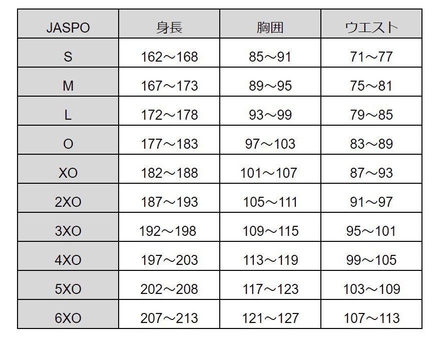 JASPO規格:S、M、L、O、XO、2XO、3XO、4XO、5XO、6XO