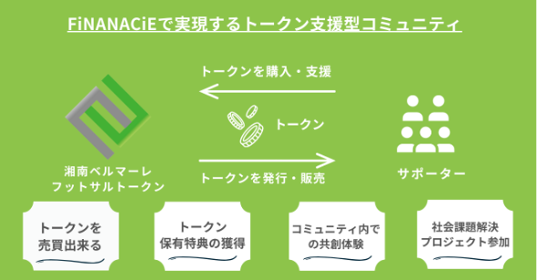 トークンを発行することで「①湘南ベルマーレフットサルクラブを軸とした社会課題解決活動コミュニティの形成」「②トークンの活用によるコミュニティの永続」を行い、目標達成に繋げていきます。