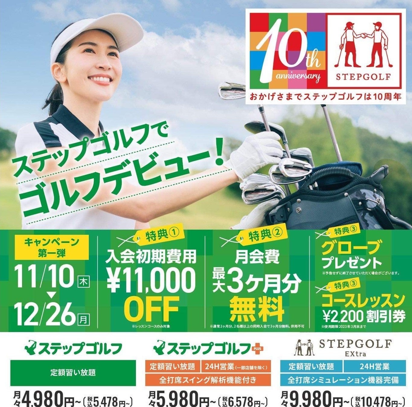 ステップゴルフ株式会社(本社:東京都千代田区、代表取締役:榎本考修、以下ステップゴルフ)は、本日2022年11月9日で創立10周年を迎えました。拝島店から始まったステップゴルフは、今や関東で89店舗まで拡大し、2022年内に出店数は96店舗に到達する見込みとなります。そこで10周年を記念しまして、特別入会キャンペーン第一弾を11月10日より実施いたします。創立時に掲げた「100万人のゴルファーを生み出す」というビジョンのもと、ゴルフというスポーツを身近に感じていただける環境づくりを行い、ゴルフというコミュニケーションツールを通じてよりよい社会の実現を目指してまいります。