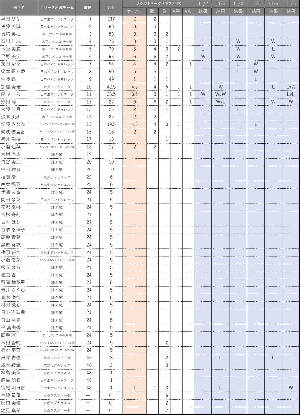 ノジマTリーグ 2022-2023シーズンにおける、「2024パリオリンピックシングルス選考ポイント 」の獲得状況をお知らせします。(ノジマTリーグ 2022-2023シーズン公式戦 11/6開催試合終了時)