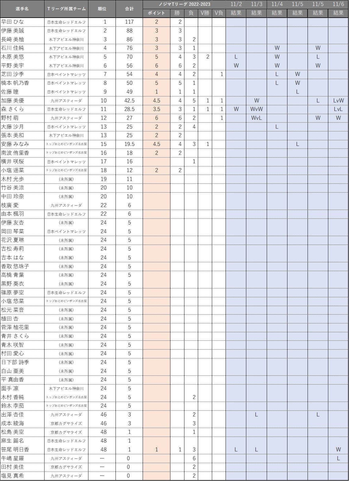 ノジマTリーグ 2022-2023シーズンにおける、「2024パリオリンピックシングルス選考ポイント 」の獲得状況をお知らせします。(ノジマTリーグ 2022-2023シーズン公式戦 11/6開催試合終了時)
