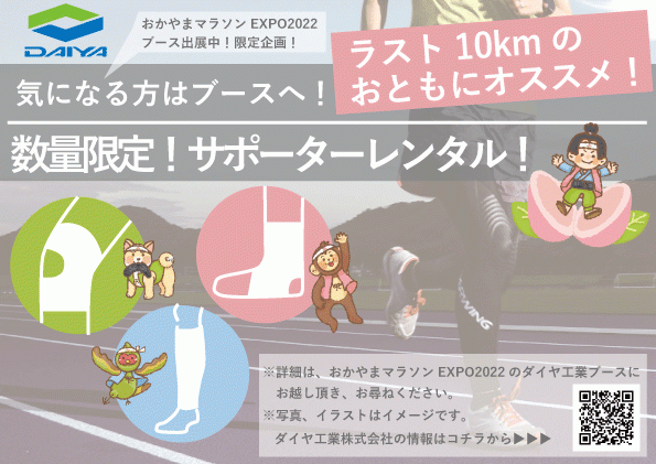 ダイヤ工業株式会社(本社:岡山県岡山市 代表:松尾浩紀)は2022年11月12日(土)・13日(日)に開催される「おかやまマラソンEXPO2022」にて、当社製品の出展やサポーターのレンタルを行います。岡山県の企業として、地域社会の皆さまに貢献すると共に、マラソンファンの皆さまに当社を認知していただく機会を創出いたします。