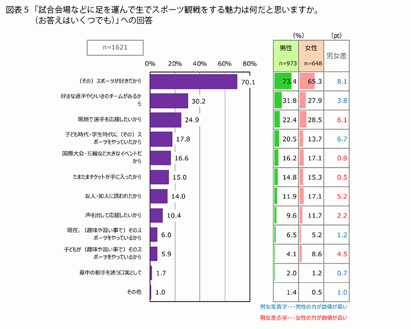 3位の「現地で選手を応援したいから」(24.9%)は女性のほうが6.1ポイント高いですが、先程の、試合会場などに足を運ぶ理由(図表4)でも、「選手を直接応援している感覚」は女性のほうが高い割合でした。選手を「推す」感覚は女性のほうが強いのかもしれません。