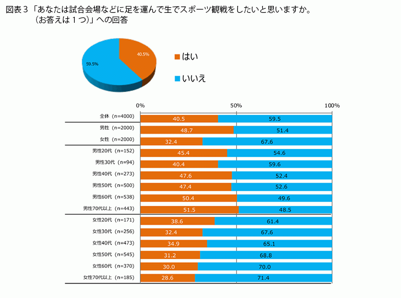 コロナ禍の影響でほとんどの試合で無観客という時期もありました。試合会場などに足を運んで生でスポーツ観戦をしたいかを聞くと(図表3)、「はい」が40.5%、「いいえ」が59.5%という結果で、生観戦派のほうが少数派ということがわかりました。性別に見ると、男性のほうが生で見たい割合がどの年代でも高いです。また、男性は年齢が上がるほど、若干ですが生で見たい割合が高い傾向になるのと比べ、女性のほうが年代が上がるほど生で見たい割合が低いという逆の結果になっています。