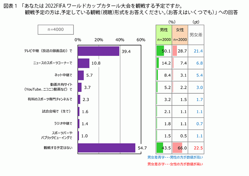 大会を観戦する予定があるかを聞いたところ(図表1)、何らかのかたちで観戦する予定の人が45.3%、「観戦する予定はない」と回答した人が54.7%でした。観戦予定がある人のうち、最も割合が高かったのが「テレビ中継(放送の録画含む)で」の39.4%です。
