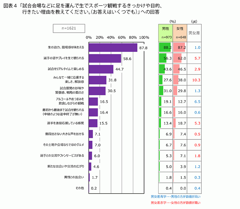 生で観戦したいという人を対象に、その目的や理由、生で観戦するきっかけを聞いたところ(図表4)、「生の迫力、臨場感を味わえる」(87.8%)がダントツで1位でした。2位以下は「選手の姿やプレイを生で観られる」(58.6%)、「試合をリアルタイムで楽しめる」(44.7%)、「みんなで一緒に応援する楽しさ、解放感」(31.8%)と続きます。「みんなで一緒に応援する楽しさ、解放感」については、ほかの項目と比べて男女で差が大きく、女性のほうが10ポイント以上高い割合になっています。