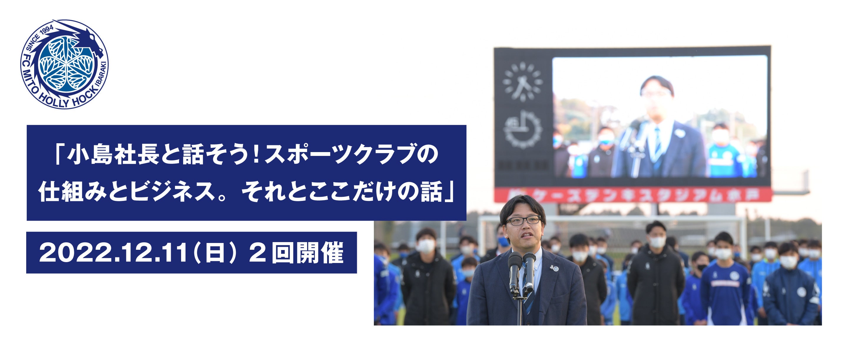 株式会社フットボールクラブ水戸ホーリーホック(代表取締役社長:小島耕、以下 水戸ホーリーホック)は、2022年12月11日(日)に、スポーツクラブの仕組みとビジネスをテーマに行う講演会『小島社長と話そう!スポーツクラブの仕組みとビジネス。それとここだけの話。』を開催いたします。
