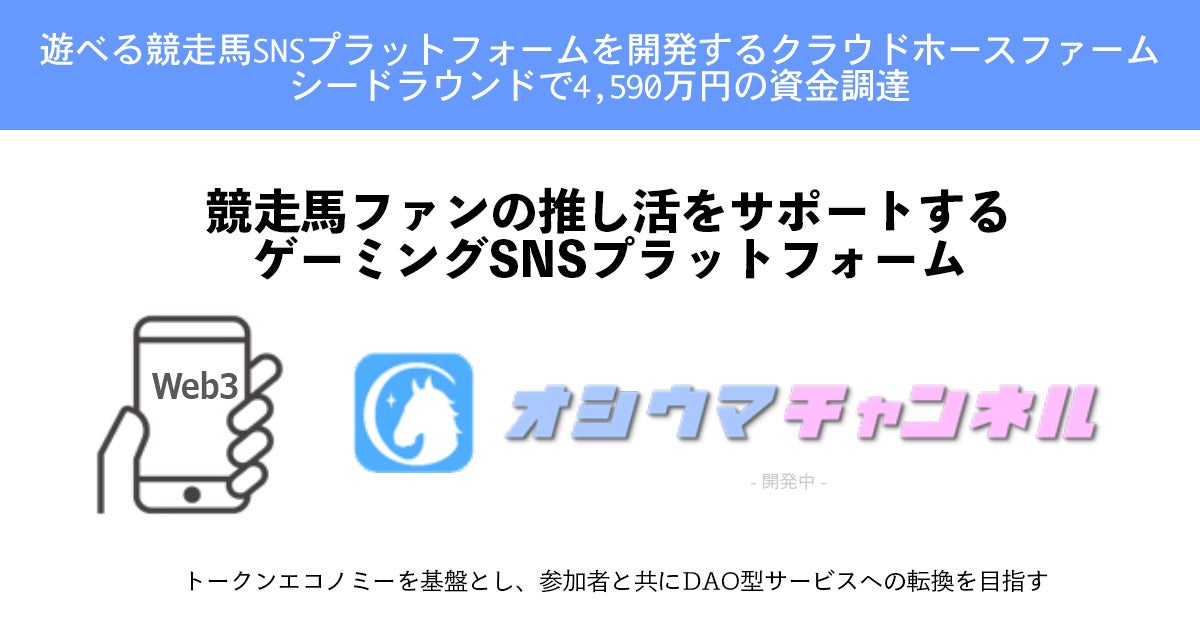 株式会社モブキャストホールディングス(本社:東京都港区、代表取締役CEO 藪考樹)が共同発起した株式会社クラウドホースファーム(本社:東京都港区、代表:吉田安寛、以下「CHF社」)が、遊べる競走馬SNSプラットフォーム「オシウマチャンネル(仮称)」の事業展開に向けて、NES株式会社、double jump.tokyo株式会社、エンジェル投資家 朝倉祐介を引受先とする第三者割当増資により、4,590万円の資金調達を実施したことをお知らせいたします。