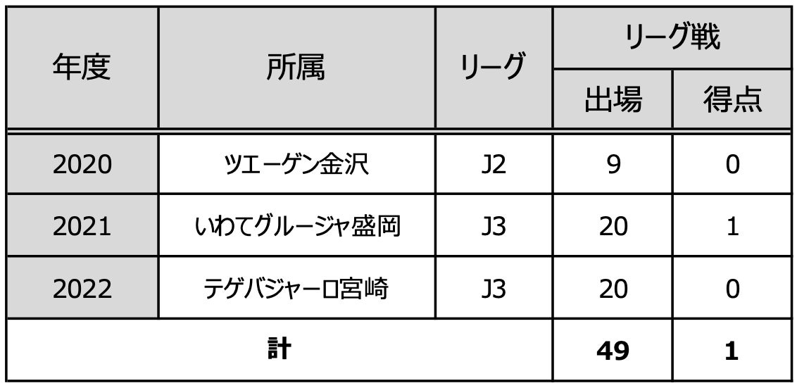J2リーグ 9試合(0得点) / J3リーグ 40試合(1得点)